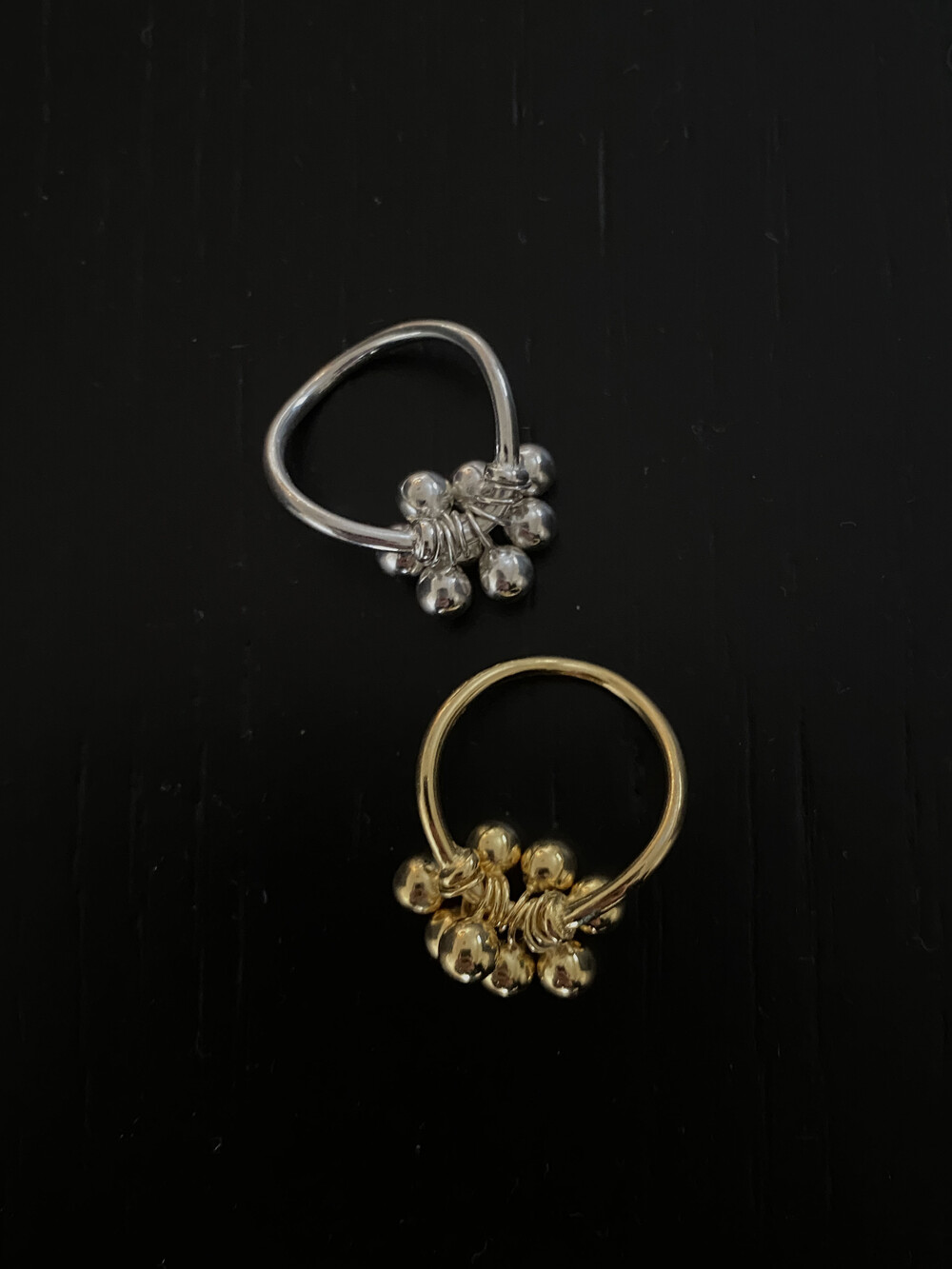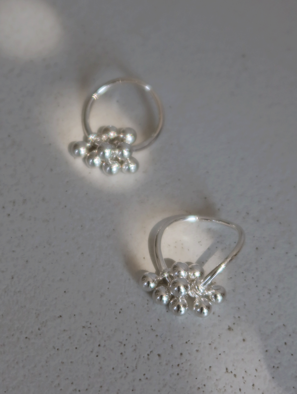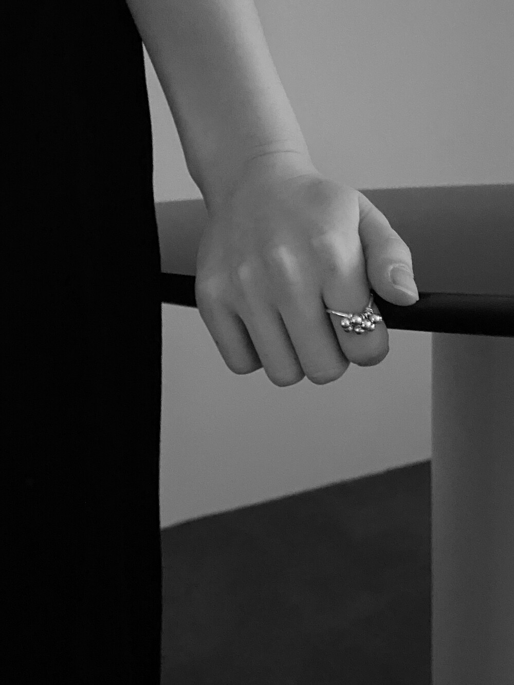 링에 행잉된 실버 볼은 O링으로 연결되어 있어 형태가 고정된 것이 아닌 움직임에 따라 자연스럽게 실루엣이 변형됩니다.