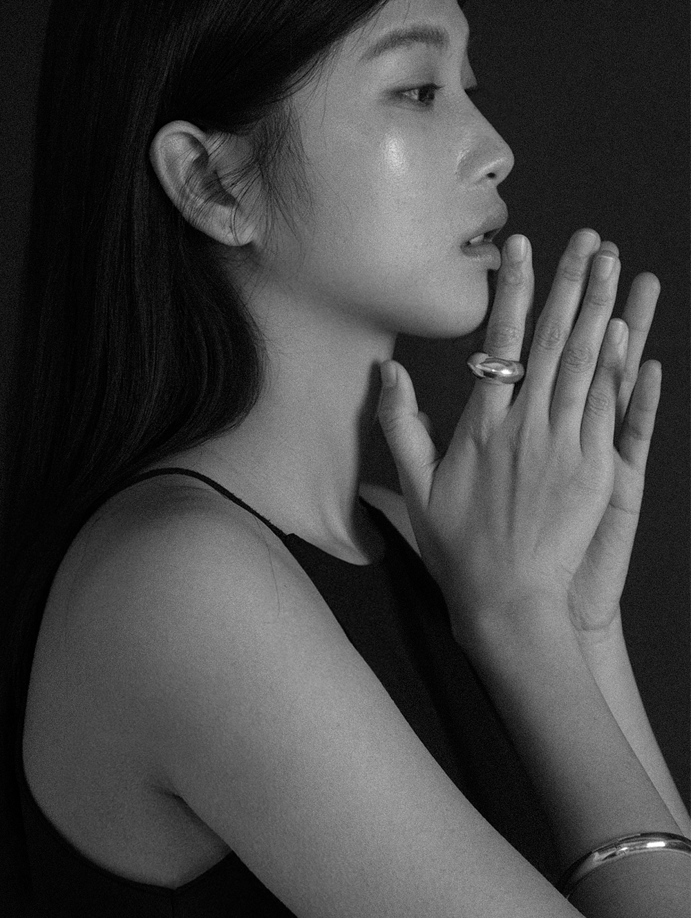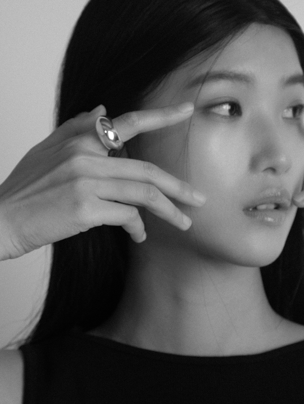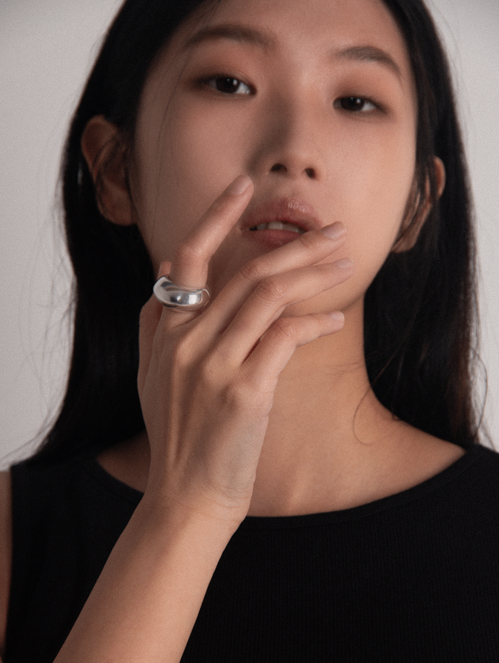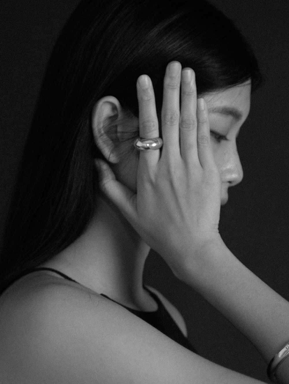 중앙이 볼록 솟은 볼드한 두께의 ring. 편안한 착용감을 위해 중량을 덜어낸 할로우 기법으로 제작되어 안쪽 면에 홀 2개가 위치함.