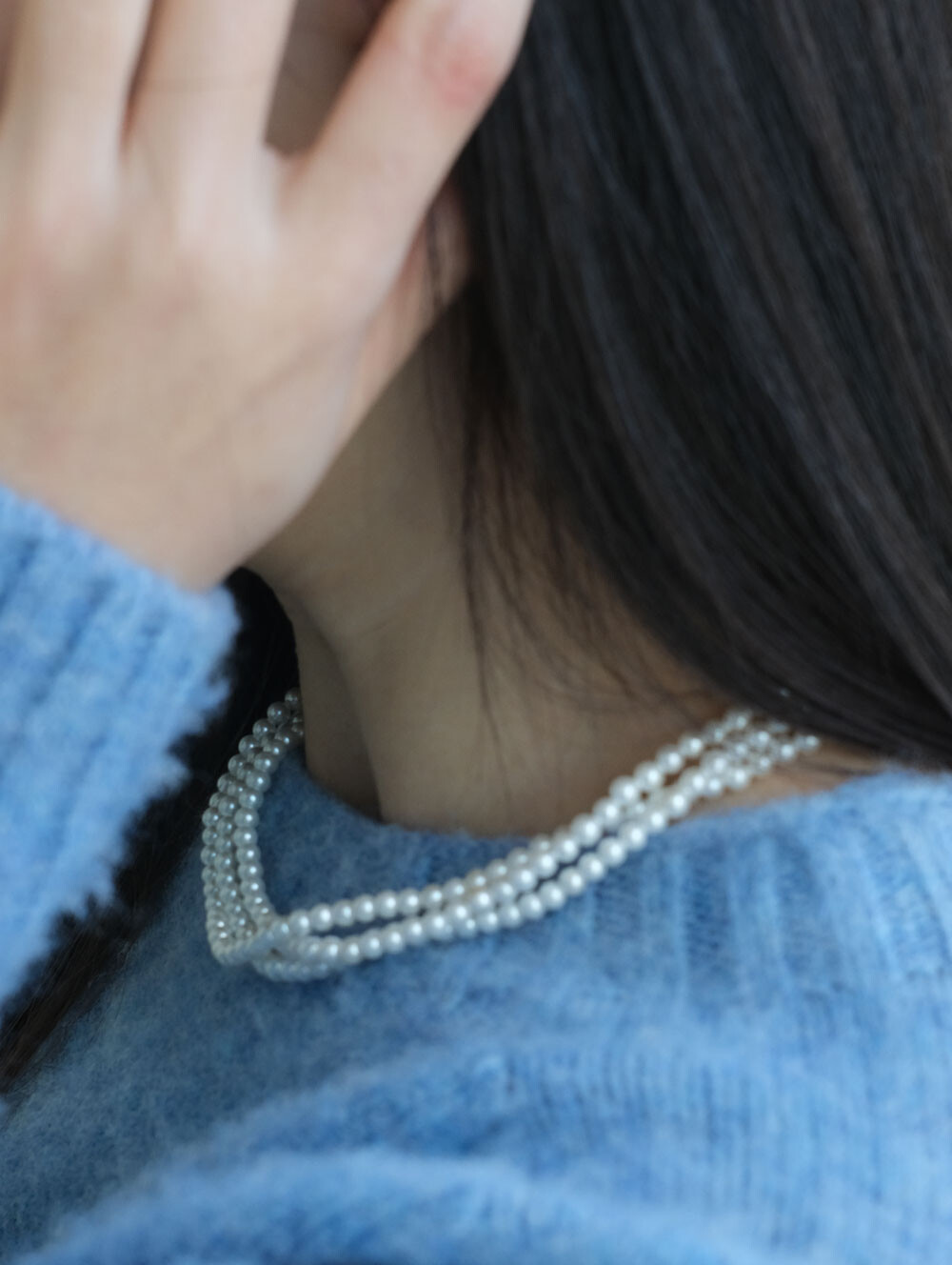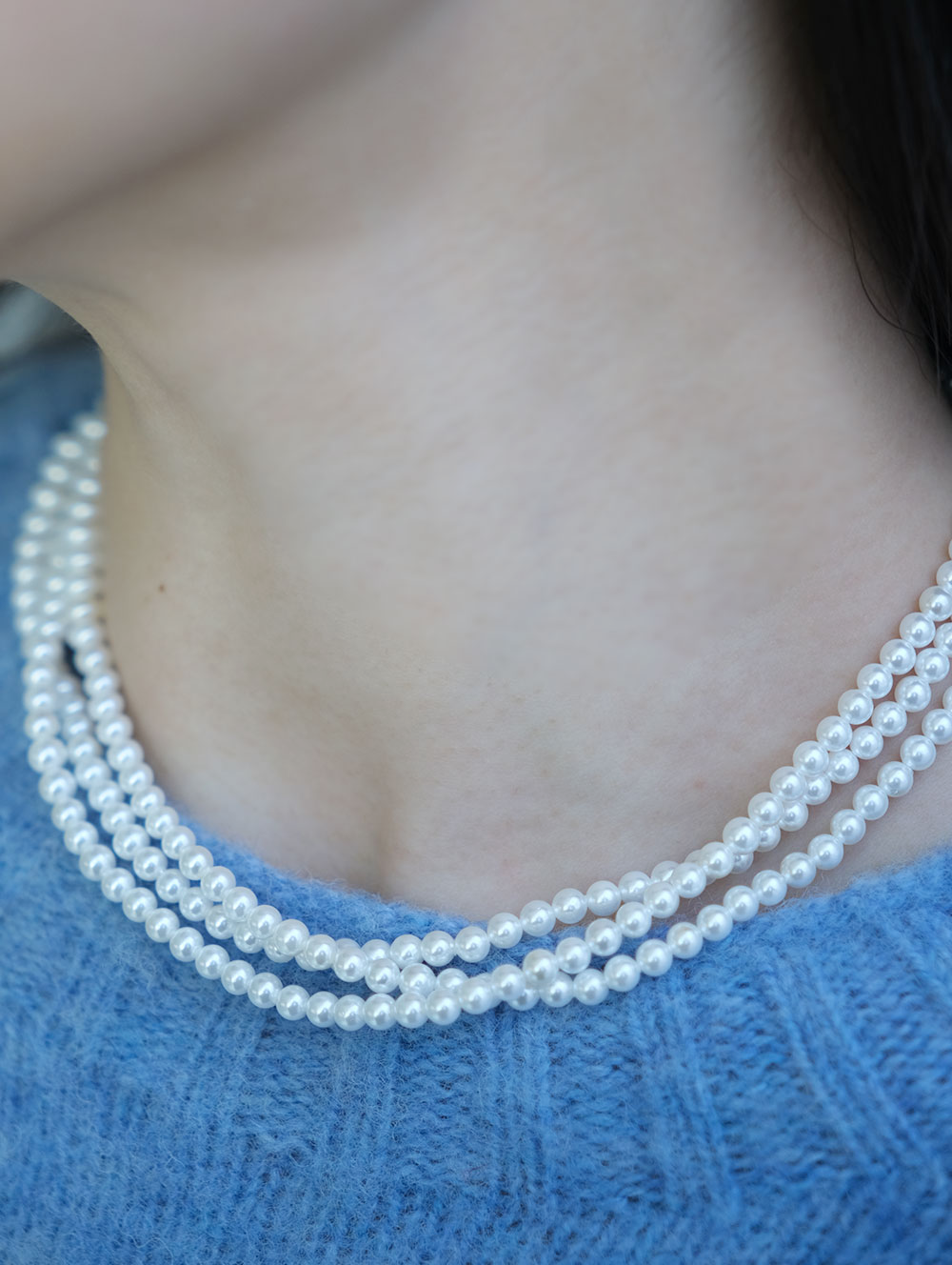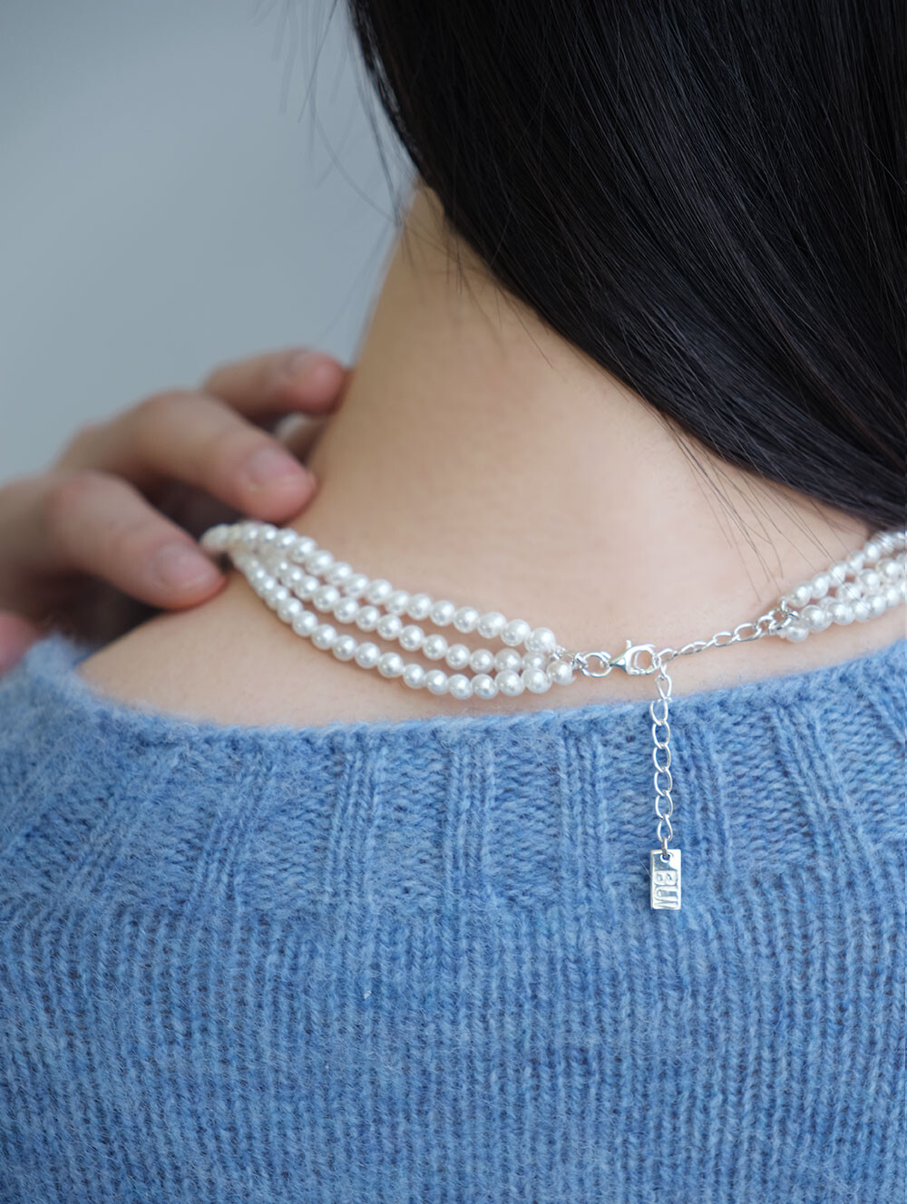 매끄러운 광택감의 4mm 핵진주가 3줄로 연결된 네크리스. 한층 더 풍성한 실루엣으로 다양한 아웃핏에 쿨한 연출이 가능합니다. 브랜드 각인된 팬던트가 행잉되어 있습니다.